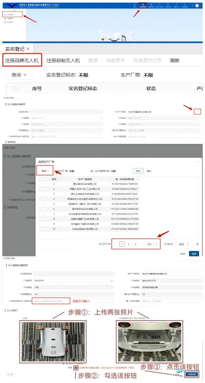 登錄好進入首頁——點擊右上角登記管理——實名登記——注冊品牌無人機——驗證所有人信息——手機掃碼刷臉驗證——選擇生產商名稱(可一頁頁看,也可直接輸入搜索)——選擇型號等相關信息(序列號需手動輸入)——根據要求長傳照片——完成注冊。